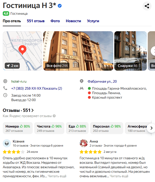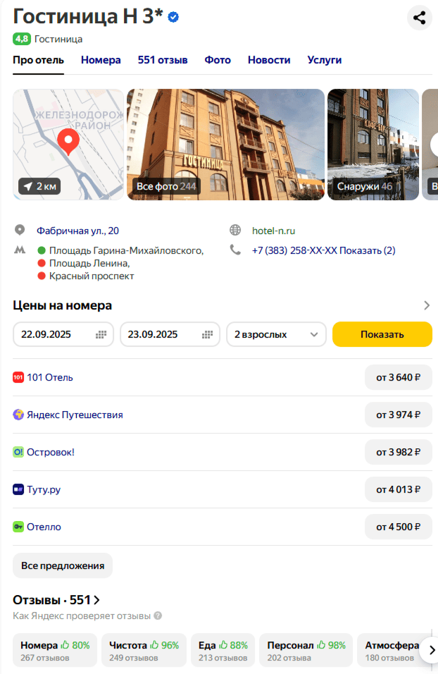 Гостиница «N» расположена в историческом центре г. Новосибирск, рядом с ЖД вокзалом. Проблема, с которой к нам обратился управляющий гостиницы: сайт был сырым и неконверсионным, репутация в сети не управлялась, а маркетинговое позиционирование отсутствовало. При высокой конкуренции в гостиничной нише это приводило к потере клиентов и низкой заполняемости. Владелец хотел исправить ситуацию и получить устойчивый поток гостей.